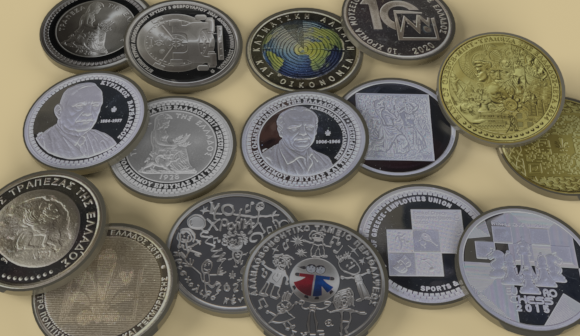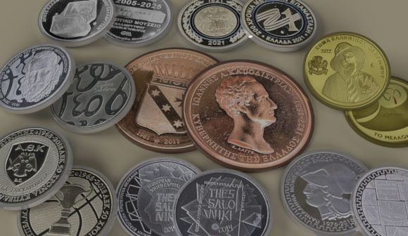 - Στην πρώτη ενότητα παρουσιάζονται επετειακά και αναμνηστικά μετάλλια που εκδίδει το Εθνικό Νομισματοκοπείο (ΙΕΤΑ) για λογαριασμό φορέων του ευρύτερου ελληνικού δημοσίου, όπως ο Οργανισμός Διαχείρισης και Ανάπτυξης Πολιτιστικών Πόρων (ΟΔΑΠ) και τα Ελληνικά Ταχυδρομεία (ΕΛΤΑ), αλλά και για τρίτους φορείς, όπως η Πανελλήνια Νομισματική Ένωση και η Αναγνωστική Εταιρεία Κέρκυρας. Ανάμεσά τους ξεχωρίζουν τα μετάλλια που εκδίδονται σε συνεργασία με την Τράπεζα της Ελλάδος και του Συλλόγου Υπαλλήλων της, καθώς και τα μετάλλια που αναδεικνύουν την ελληνική αρχαιολογική κληρονομιά (ΟΔΑΠ, Μουσείο Ακρόπολης).