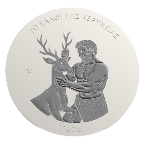 The obverse depicts Hercules capturing the Ceryneian hind. At top is the wording “THE CERYNEIAN HIND”, to the left a palmette (mintmark of the Greek mint) and at bottom the minting year (“2026”).