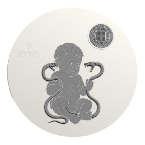 The reverse features the infant Hercules strangling the snakes that Hera had sent against him. To the right is the national coat of arms and to the left the denomination (“9 EURO”).